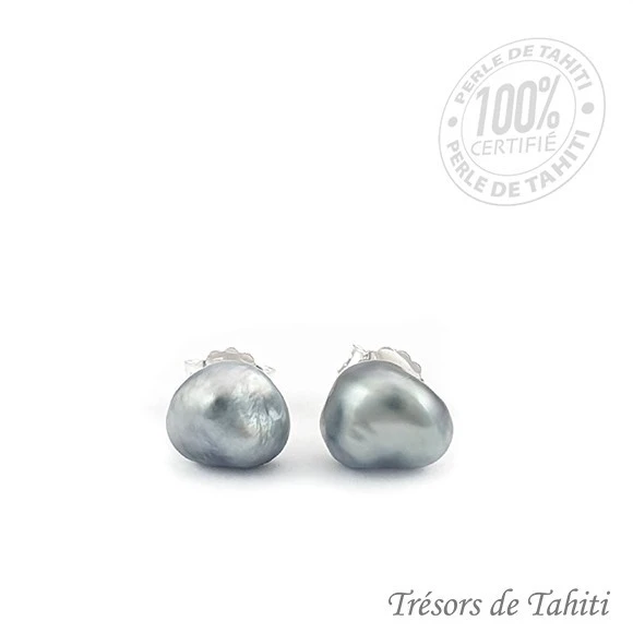 • 2 Keishis de Tahiti Baroques : Couleur Gris médium Argenté, avec un beau lustre, et un diamètre de 7,27 mm et 7,28 mm.