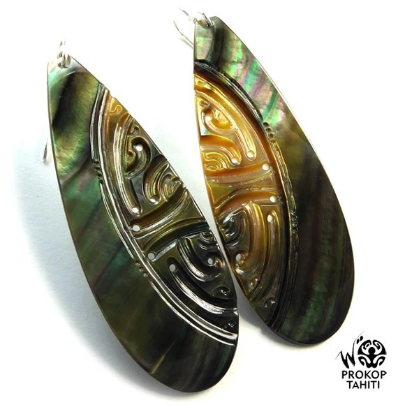 • Boucles d’oreilles nacre massive Collection SpĂ©ciale Prokop Tahiti ton foncĂ© touches claires (XXL 6 cm de hauteur).