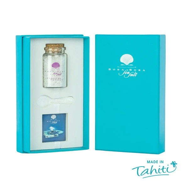 • Offrez ce Sel unique au Monde pour ses origines, sa pureté, et son élégance dans ce Coffret Cadeau aux couleurs du lagon de Bora Bora.