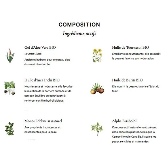 • MonoĂŻ de Tahiti Appellation d’Origine Edelweiss, Jus d’Aloe Vera et Huile de Buriti.