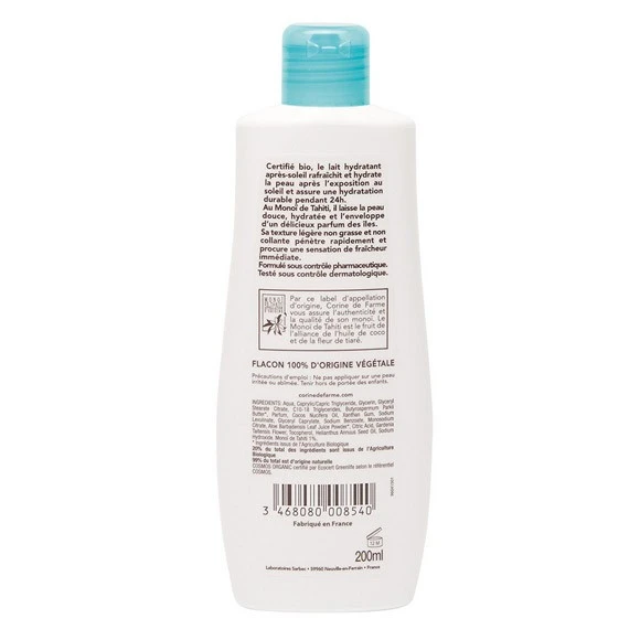 La Boutique du Monoï a sélectionné pour vous ce lait après solaire Bio Corine de Farme apaisant et hydratant la peau après l’exposition au soleil. Sa texture légère et fluide pénètre rapidement, non grasse et non collante. Elle procure une sensation de fraîcheur immédiate. Enrichi en Monoï de Tahiti Appellation d’Origine, aux vertus hydratantes et régénérantes, en beurre de Karité et Aloe vera, il hydrate votre épiderme durant 24h avec un léger Parfum des Îles sans allergènes, qui invite au voyage vers les lointains rivages des Mers du Sud : Rapa Nui.