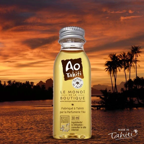 Ao signifie la béatitude, le bonheur, en langue tahitienne. Ao est empreint de beaucoup de spiritualité, évoquant le Monde supérieur. Comme adjectif, il désigne également un liquide de première qualité. Ao Tahiti et son parfum sont des créations de La Boutique du Monoï. Toute la gamme Ao Tahiti à découvrir ici.