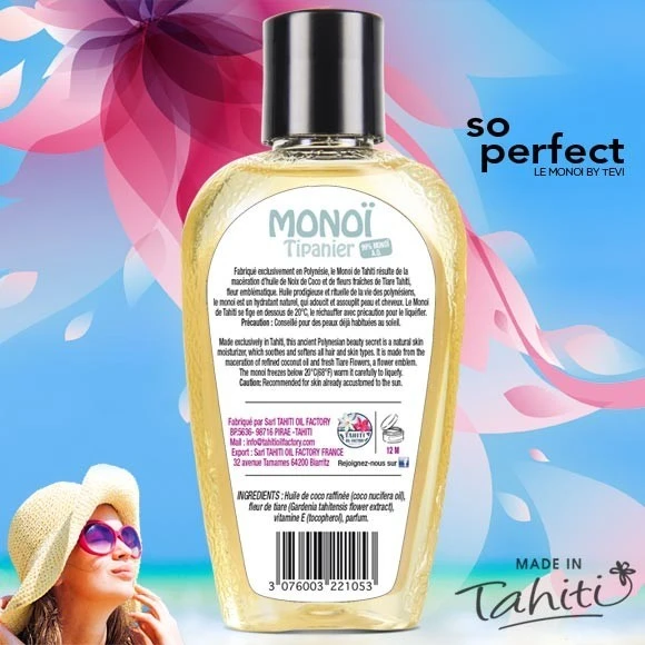 • 99% Monoï de Tahiti Appellation d’Origine, huile de Coco infusée de fleurs fraîches de Tiare Tahiti.