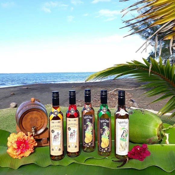 • Le 1er Rhum de Tahiti, entièrement produit et distillé sur le domaine d’Atimaono à Papara Tahiti, et embouteillé à Tahiti par la Distillerie Moux.
